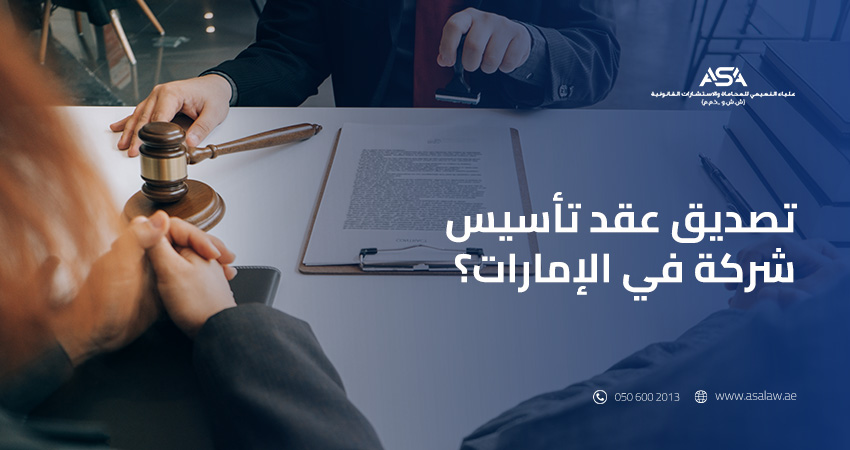 تصديق عقد تأسيس الشركة يعني اعتماده رسمي من الجهات المختصة مثل كاتب العدل أو عبر الوسائل الإلكترونية المعتمدة من وزارة الاقتصاد أو دائرة التنمية الاقتصادية أو من خلال مكتب مرخص كمكتب علياء سالم النعيمي للمحاماة، ويعد هذا التصديق شرط قانوني اكتمال تأسيس الشركة.